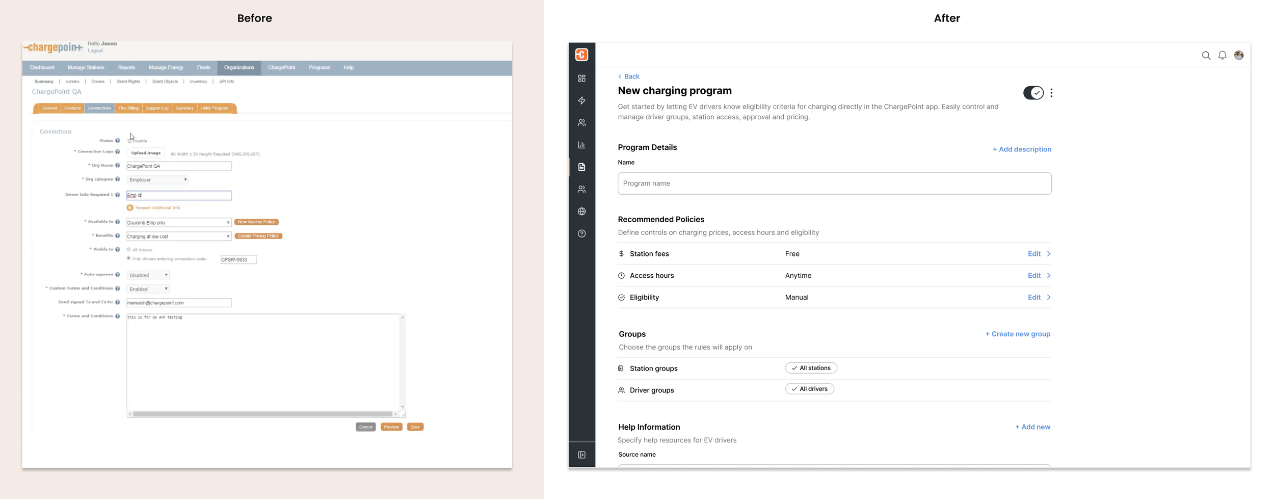 Context ChargePoint’s admin portal was critical for workplaces to manage access on EV charging stations and help drivers accordingly use charging stations . Overtime the admin portal had grown into a powerful but complex, fragmented tool with outdated patterns. It worked well for power users like support agents who knew where everything lived, but left everyday station admins struggling with even the most basic tasks, like setting access policies and approving drivers. This led to operational bottleneck. Support was swamped with 20k setup-related cases and stations took up to 6 months before becoming available to drivers.